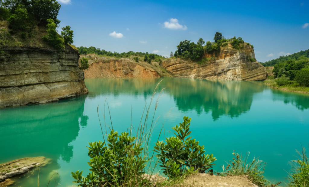 Deskripsi Menarik: Danau ini terbentuk secara tidak sengaja dari lubang bekas galian tambang batu bara yang terisi air hujan. Keunikan utamanya terletak pada warna airnya yang biru jernih kehijauan yang kontras dengan dinding-dinding tebing kapur berwarna kecokelatan yang mengelilinginya. Formasi tebing yang terkikis secara alami menciptakan tekstur yang artistik dan sangat populer sebagai latar belakang foto pre-wedding atau sekadar konten media sosial.