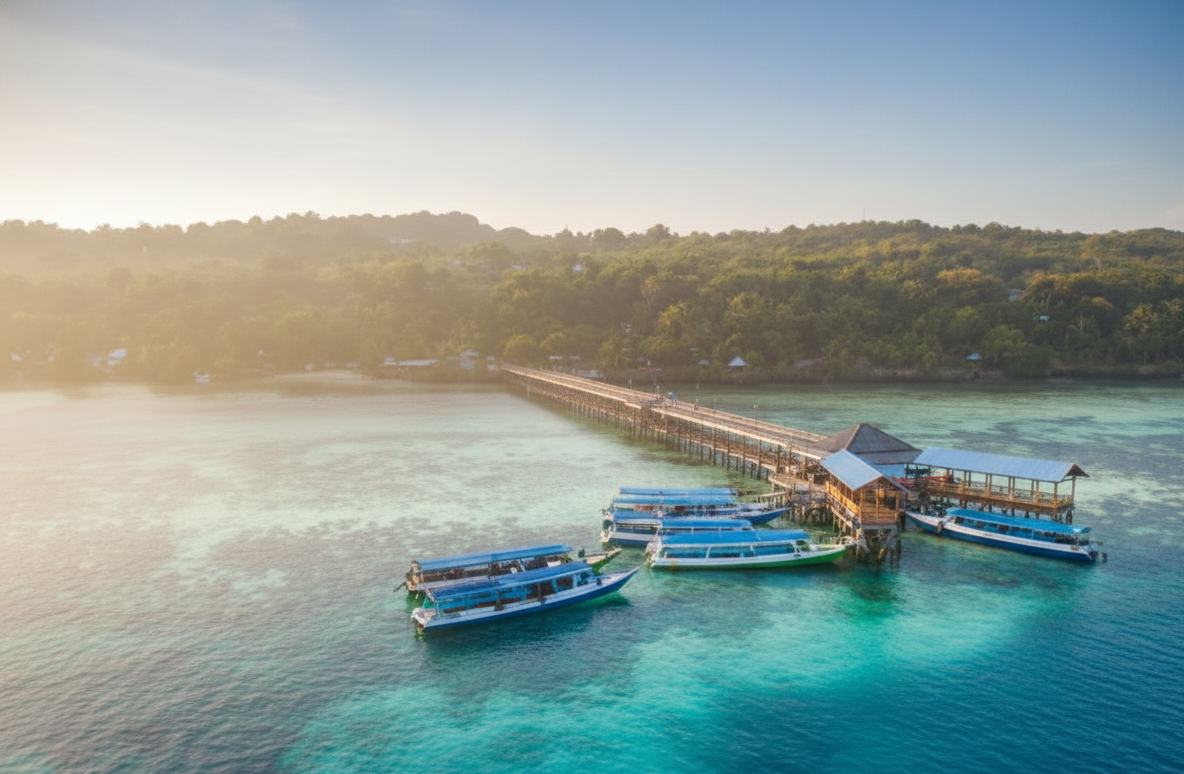 Jenis Transportasi yang Digunakan: Kapal motor/perahu tradisional (Taxi Air) dari Dermaga Kasiwa, serta sepeda motor untuk berkeliling pulau.