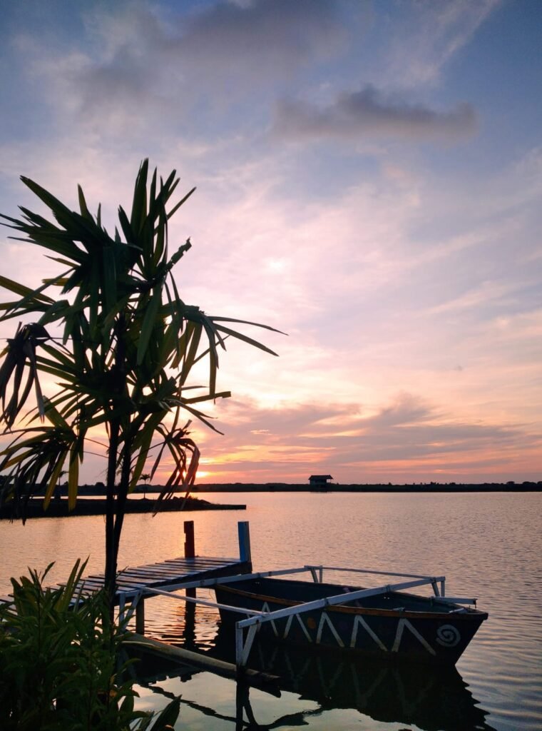 Keindahan tempat ini semakin sempurna dengan pemandangan matahari terbenam yang dapat disaksikan langsung dari tempat duduk Anda. Cahaya senja yang memantul di permukaan air menciptakan suasana hangat dan romantis, ideal untuk bersantai bersama keluarga atau orang tercinta.
